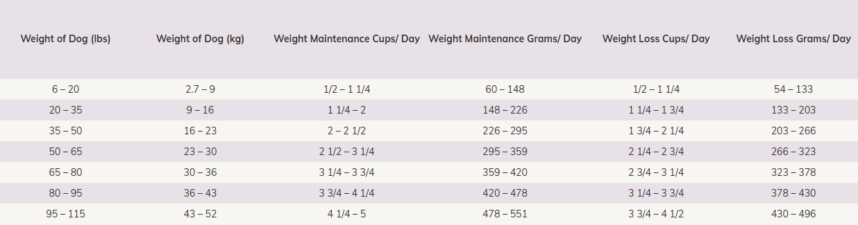Dogs over 115 lbs (52kg): Add approximately 1/3 cup (34g) for every 10 lbs (4.5kg) over 115 lbs.